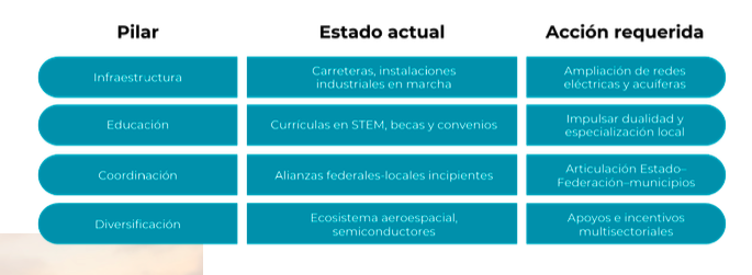 En entrevistas con Referente, representantes de la industria aeroespacial, de energías limpias y del sector logístico han resaltado la necesidad de alinear infraestructura, vivienda, planeación urbana y formación de talento.