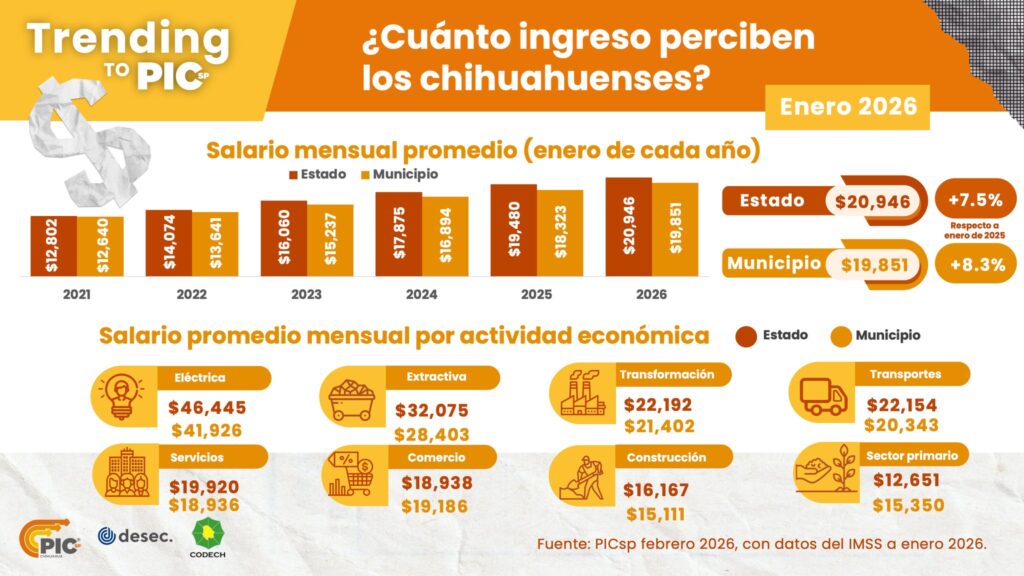 La tendencia de los últimos años deja claro que Chihuahua no sólo tiene buenos salarios, sino que estos han ido creciendo de forma constante. Según la infografía de PICsp, el salario promedio mensual estatal pasó de 12,802 pesos en enero de 2021 a 20,946 pesos en enero de 2026. En el municipio de Chihuahua, el avance fue de 12,640 a 19,851 pesos en el mismo periodo.