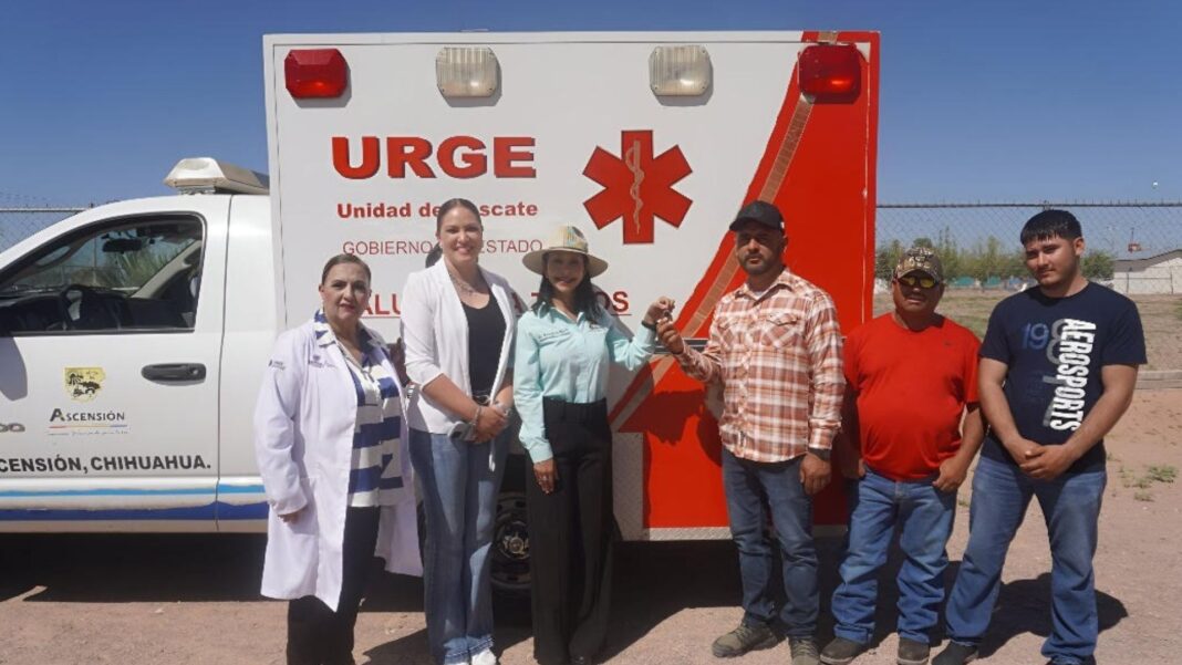 Ascensión, Chih.- La diputada local del Distrito 01 y presidenta de la Comisión de Salud, Yesenia Reyes, acompañó a la presidenta municipal de Ascensión, Ivonne de la Hoya en la entrega oficial de una ambulancia del sistema URGE al Ejido 6 de Enero.