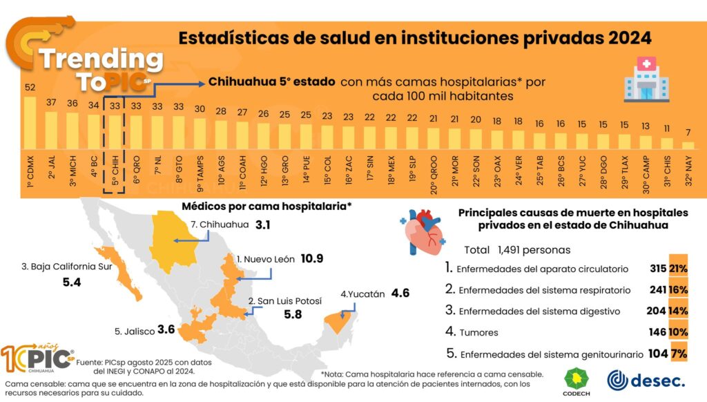 Los datos confirman que Chihuahua cuenta con infraestructura hospitalaria privada relevante, pero la proporción de médicos y enfermeras por cama sigue siendo un desafío. Mejorar este indicador no solo podría reducir la mortalidad por enfermedades crónicas, sino también elevar la calidad y la rapidez en la atención.