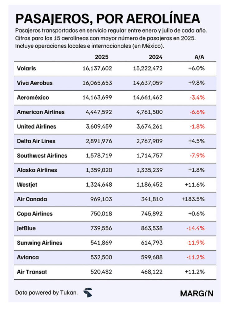 • La lista de pasajeros la encabeza Volaris, con 16,137,602 en este mes de julio de este año 2025, le sigue Viva Aerobús con 16,065,653, Aeroméxico con 14,163,699, American Airlines 4,447,592, United Airlines con 3,609,459. Así las cifras con mayor operatividad.